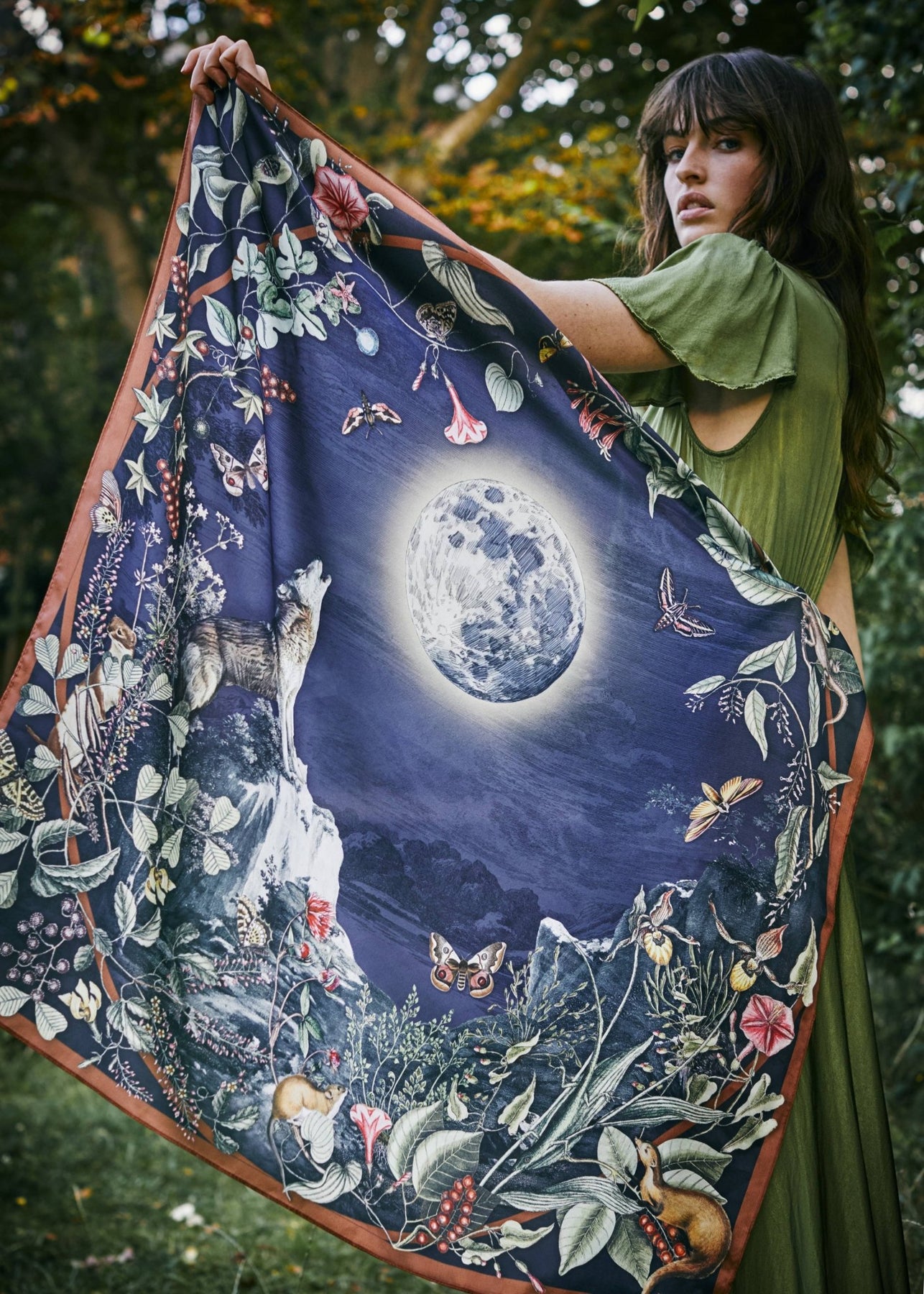 Step into a world of quiet mystery with the Wolf Garden Narrative Square Scarf, a beautifully illustrated piece inspired by the magic of the natural world at dusk. Set against a deep, moody backdrop, the design features a majestic wolf beneath a moonlit sky, surrounded by delicate florals and woodland details that bring the scene to life.